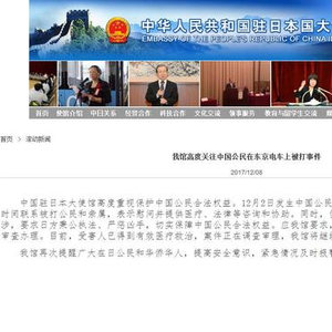 中新网12月8日电 中国驻日本大使馆网站消息,驻日本大使馆高度重视保护中国公民合法权益。当地时间12月2日发生中国公民在东京电车上被打事件后,使馆第一时间联系被打公民和亲属,表示慰问并提供医疗、法律等咨询和协助。