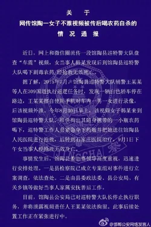 9月3日凌晨,邯郸市公安局发布通告,称馆陶县公安局已对巡特警大队长停止执行职务,并将泄露视频责任人王某某依法拘留。