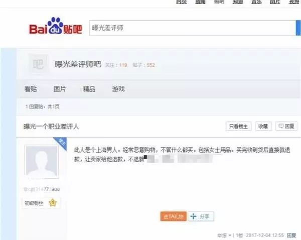 “此人是上海男人,经常恶意购物,不管什么都买,包括女士用品,买完收到货后直接就退款,不退就差评。电话139……” “全部卖家当心此人,张某,手机:186……”在这个叫“曝光差评师”的贴吧里,很多自称卖家的网友贴出了别人的姓名、手机号,家庭住址等个人详细信息,称这些人为职业差评师,有些还列出了他们是差评师的证据。