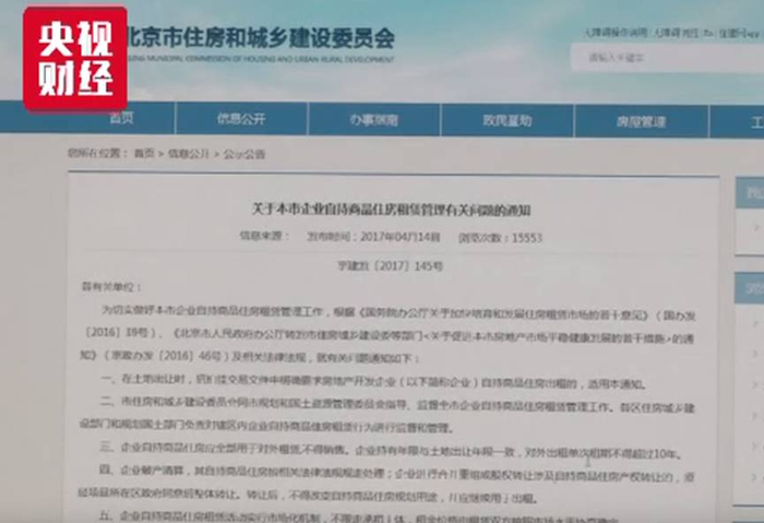 今年4月,北京市住建委和市规土委联合发布《关于本市企业自持商品住房租赁管理有关问题的通知》,明确企业持有商品房年限为70年,对外单次租期不得超过10年。尽管对押金和租赁价格没有提出明确规定,但《通知》中明确,企业不得以任何形式将自持商品住房“以租代售”或通过其他方式变相销售,行为一旦予以认定将纳入“黑名单”,规划国土部门据此取消相关企业后续参与本市土地招拍挂资格,住房城乡建设部门对其开发资质予以降级或者注销。