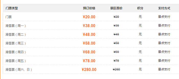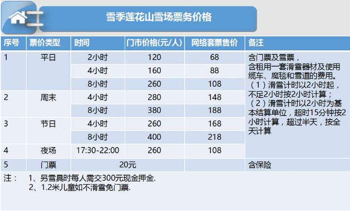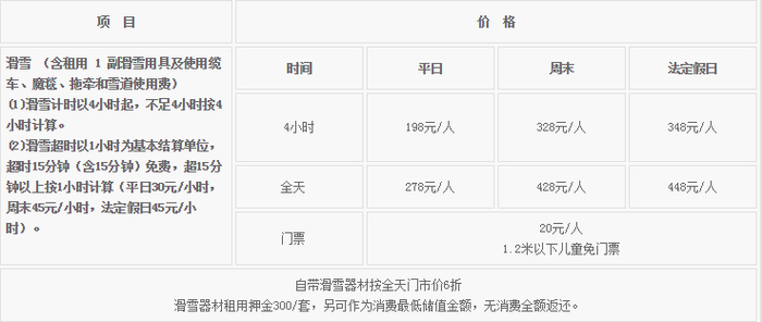 周末(全天) 门市价:260元(以景区实际价格为准),包含项目:含租用一副滑雪器材(雪鞋、雪板、雪杖)及使用缆车、滑毯、拖牵的费用,自带滑雪器材5折。滑雪超时/10分钟/10元计算。