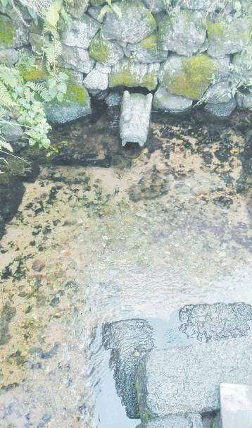 穿过雕花的火山石石桥,就进入了龙婆西湖庙所在的半岛。逆溪流上行约30余米,就看到了一处紧挨庙墙、大约二、三平方米的水池,泉水正从一尊火山石雕刻而成的龙首口中汩汩流出,水质清澈见底,水池旁边放着一把供人取水的水瓢,水池的水通过另外一尊龙首与小溪相通,泉水出口处放置了数块火山石,以方便人们洗涮。