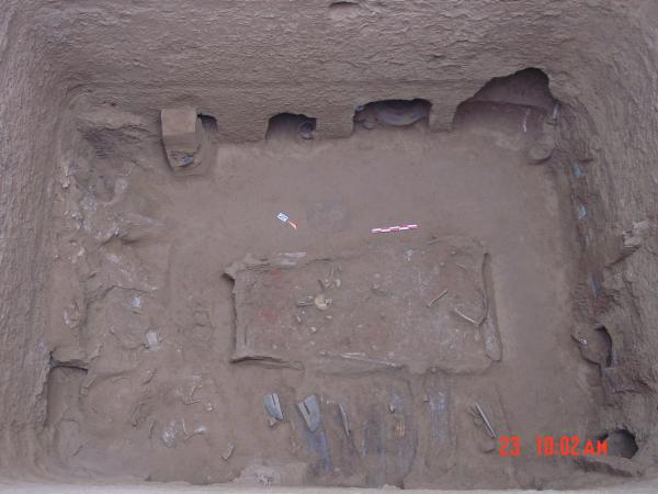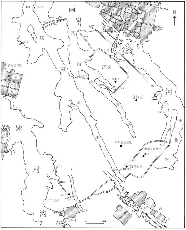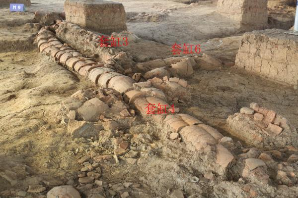 山西襄汾陶寺早期遗址总面积约160万平方米,距今4,300至4,100年。以13万平方米宫城及南外侧下层贵族居住区小城(近10万平方米)构成核心区。宫城有结构复杂的曲尺形角门,宫城内已发现疑似“冰窖”附属建筑。下层贵族居住区小城内已发现双开间半地穴式住宅。宫城东西两侧为普通居民区,宫城东侧有大型仓储区。宫城东南为早期王族墓地,已发掘王墓6座,随葬品在百件以上,出土有彩绘陶龙盘、彩绘陶礼器、彩绘木器、玉石钺、大厨刀、日用陶器等。大贵族墓数十座,随葬品数十件,包括石磬、陶鼓、鼍鼓等礼乐器组合,彩绘陶器和日用陶器。其余近千座小墓几乎没有任何随葬品。阶级对立状况凸显,金字塔式社会结构清晰。都城的结构与性质初步具备。