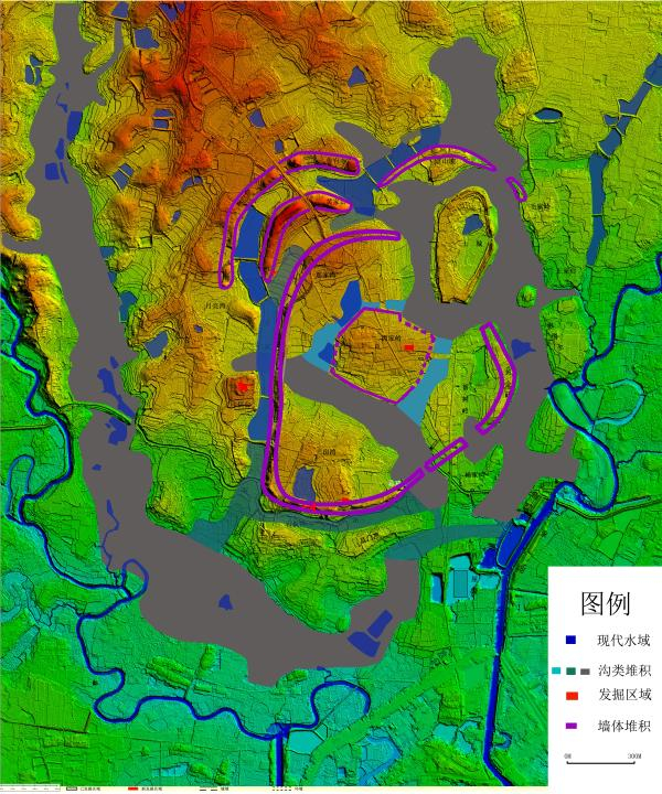 其一、勘探发现石家河遗址核心区域存在多重人工堆筑的大型城壕遗迹,为宏观上认识石家河遗址的布局结构提供了新视角。新发现的谭家岭城址位于石家河遗址的中心,平面大体呈圆角方形,城垣东西长440米、南北宽390米,城垣内总面积17万平方米,城壕内总面积则达26万平方米。