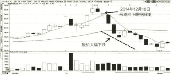 一般来说,反转发生或者反转发生之后形成的向下跳空为突破性跳空,它意味着一个旧趋势的结束和一个新趋势的开始,如果跳空发生在高位或者顶部的话,就是趋势反转向下的重要警示,如果某一只股票跳空低开,随后再持续低走,就会形成比较明显的跳空阴线,但是这种假象很容易被股民识破。因此,庄家发明了一种更为隐蔽的方法去诱导股民上当,其具体操作方法是以跌停板的价格低开,然后再小幅拉高,就可以使其完成由阴到阳的转变,但实质上股价是下跌的,这就是所谓的留下跳空缺口的向下破位阳线,是庄家主要的出货方法之一。