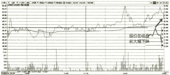 收盘前瞬间砸低股价,是指在交易日收盘前的半分钟之内,突然出现一笔大卖单将股价砸到一个很低的位置。由于大部分技术指标的计算方式都涉及收盘价,改变收盘价可以直接改变技术指标的数值,但是又不会对其他时间的交易产生重大的影响,所以庄家会在收盘时砸低股价(如图6-9所示)。分析其具体目的,可以总结为以下几种: