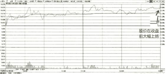 收盘前瞬间拉升股价,是指在交易日收盘前的半分钟之内,突然出现一笔巨大的买单将股价拉升到一个高位。庄家虽然具有雄厚的资金实力,但是没有一个庄家会随意浪费手中的资金。如果庄家想在股价运行的过程中将股价拉升到高位,就要花费更多的资金去将股价维持在这个位置。因此,为了能用最小的资金将股价拉升到一个高位,庄家会在尾市的时候突然挂上一笔大买单(如图6-8所示)。