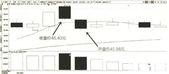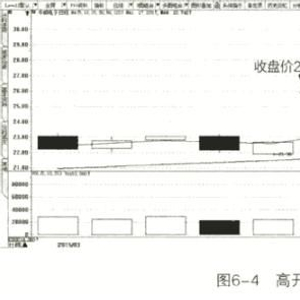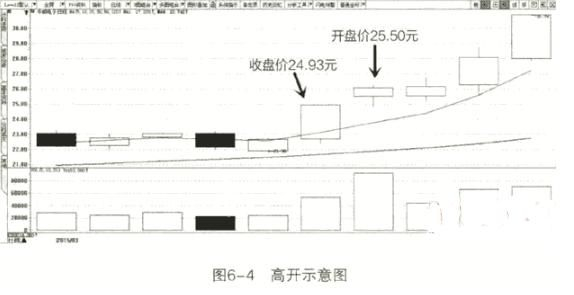 高开指的是当日的开盘价比前一个交易日的收盘价高(如图6-4所示)。股票大幅高开具体可分为两种:一是庄家有准备的高开,这种手段在股价强势拉升的过程中比较常见,由于个股在不同的运行阶段存在着一定的差异性,因此这种有准备的高开有较强的目的性;二是没有准备的高开,这种现象经常会在突发利好袭来的时候出现,市场中需求远大于供给,导致股价以市场行为自然高开。