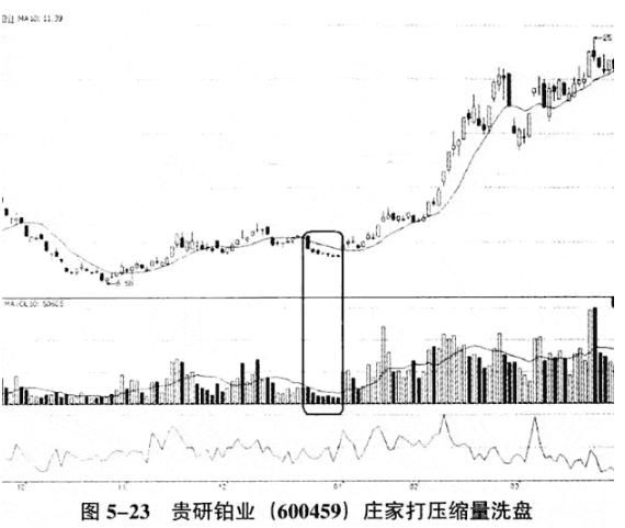 如图5-23所示,贵研铂业(600459)在反弹中刚刚有了一些涨幅,就随着指数的上涨而开始下跌。庄家充分利用了这次洗盘的机会,使股价在缩量中缓慢下跌,给投资者一种“股价上涨幅度过大后,又一次开始了阴跌”的错误概念。事实上,该股在连续五天的下跌中,股价并没有多大的下跌幅度,而是出现了“欲跌不能”的怪现象。既然投资者当中没有人会支持下跌,严重的缩量下跌就意味着上涨的趋势已经形成,股价在企稳之后会再次上涨。