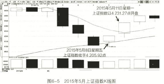 2015年5月10日央行决定,自2015年5月11日起降息,金融机构一年期贷款基准利率下调0.25个百分点至5.1%;一年期存款基准利率下调0.25个百分点至2.25%。由于央行降息属于突发性利好消息,于是2015年5月11日上证指数形成了高开形态(如图6-5所示)。