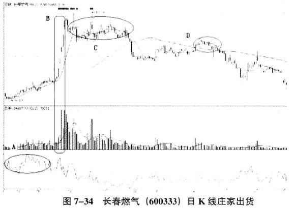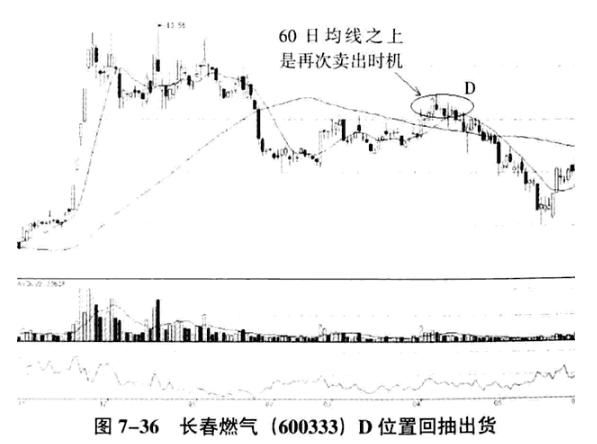 如图7-36所示,长春燃气(600333)高位横盘之后,股价开始破位下跌,又在60日均线的下方经过整理之后重现企稳上涨。如果在横盘区域C位置(见图7-35)没有来得及卖出股票,股价下跌之后回抽到60日均线附近是投资者卖出股票的最佳时机。在股价上涨的时候,60日均线可以发挥支撑作用支持股价不断地创出新高,但是在股价高位跌破均线之后,60日均线就变成了上涨的阻力线。下跌当中股价每一次回抽到60日均线时,都是出货的最佳机会,而长时间地等待出货机会,投资者的损失将会进一步加剧。