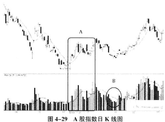 如图4-29所示,柳钢股份上涨的同期,A股指数也没有停滞不前,不断放量上升的指数正为个股的不断上攻提供了非常强大的支撑。图中显示A股指数自熊市以来首次出现的连续放量上涨,正是指数的这次放量上攻穿破了下跌的趋势线,打开了上涨的空问。图中A位置是指数开始反转的位置,不断放大的成交量与前期下跌时的缩量形成了鲜明的对比。而在后来的B位置,指数下跌时,成交量虽然再一次萎缩,但是相比前期指数下跌时的缩量,此处成交量还是大许多。这样看来指数在此时也开始了真正的反转。