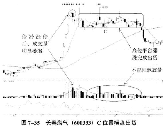 如图7-35所示,长春燃气(600333)在连续五个涨停板之后,股价的上涨幅度已经很大了。涨停板被打开后,股价缩量下跌并开始横盘整理。图中股价高位横盘时,成交量总体上是不断萎缩的,但是在萎缩的过程中,成交量也有断断续续的放大情况出现。这种不连续的放量现象主要是庄家出货所为,而不是拉升中的放量。既然投资者已经同庄家一路持有股票,并且获利丰厚,那么在庄家出货时,投资者也应该果断了结头寸。图中显示,股价在横盘弱势整理的过程中,重心不断向下移动,最终在10日均线与60日均线交汇前开始破位下跌了。