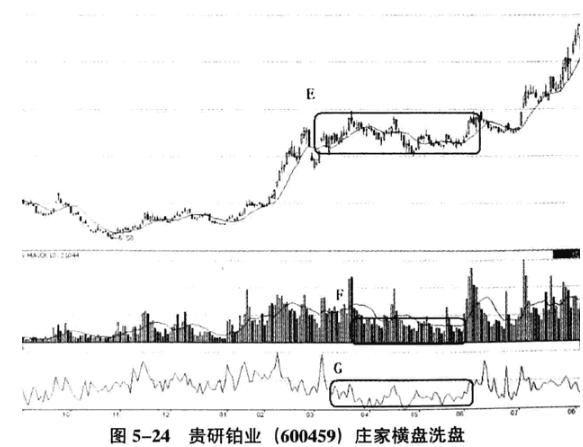 如图5-24所示,同是贵研铂业的洗盘过程,庄家却采取了截然不同的方式。图中显示的洗盘采取的是横盘滞涨的方式。股价的波动虽然不大,但是长时间的横盘足以让投资者的耐心得到前所未有的严峻考验。