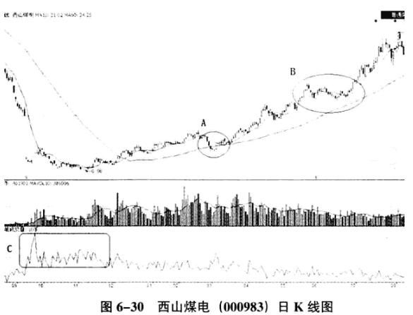 如图6-30所示,西山煤电(000983)的庄家在该股处于底部7元/股附近的价位时,就开始了明显的放量建仓:从图中的均笔成交量上看形成了一个明显的放大区域,均笔成交量最高达到27手之多,而平时庄家活动不频繁时只有不到16手。庄家在放大均笔成交量完成建仓之后,股价开始缓慢上涨。同其他资源类的基金重仓股一样,西山煤电的庄家的拉升方式也是比较稳定的。股价以稳定的涨幅上涨,上涨过程中没明显的回调现象出现。投资者进驻这样的股票之后,需要的是不急不躁地耐心持股,等待庄家完全发挥拉升股价的潜力。在该股的拉升的过程完全呈现在投资者面前时,投资者可以清晰地看出股价拉升过程中仅有两个明显的回调位置,即图中的A、B位置。那么在股价回调的时候应该如何处理呢,下边分别介绍一下: