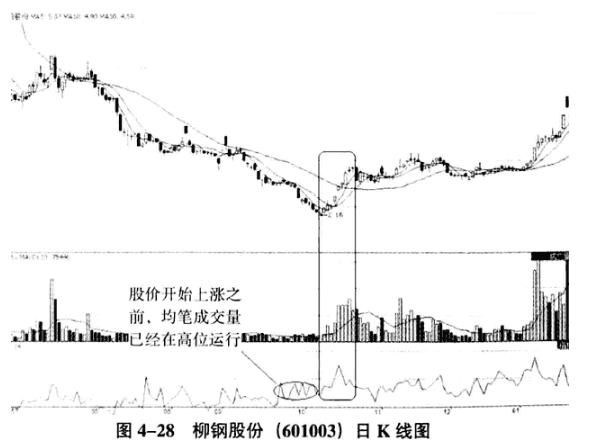 如图4-28所示,柳钢股份(601003)在股价见底之前,从均笔成交量上来看,有了明显放大的现象。图中显示的锯齿状放大成交量,正是庄家真正建仓前的预演过程,真正开始建仓发生在股价和成交量同步大幅度上涨之时。在图中的矩形区域中,股价连续一个多星期上涨,终于有效突破了上方均线的压制而进入到上涨趋势当中。股价突破的过程也是成交量不断放大的过程,均笔成交量也有一定的上涨,这正好说明庄家利用拉升的机会大量地吃货,散户也趁机买入股票并把股价推向了高位。投资者在这个时候开始建仓是很不错的选择。