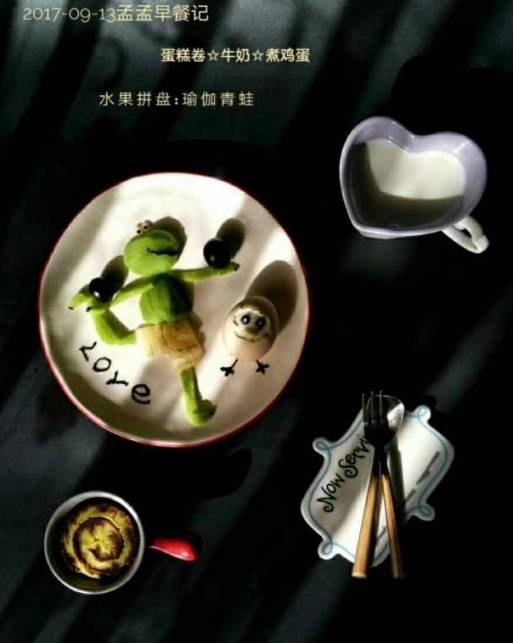 瑜伽青蛙王子水果拼盘,牛奶,杂粮粥,煮鸡蛋宝宝,红薯小鸭子