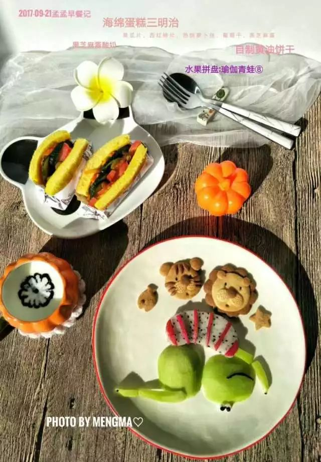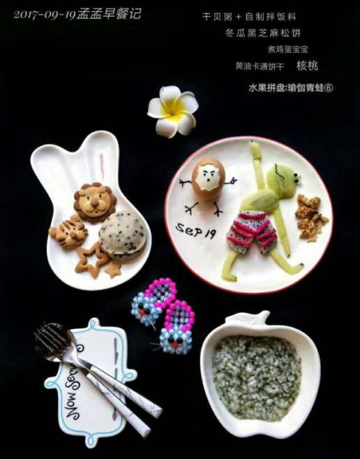 瑜伽青蛙王子水果拼盘,干贝粥+自制拌饭料,冬瓜黑芝麻松饼,核桃和煮鸡蛋宝宝,黄油卡通饼干