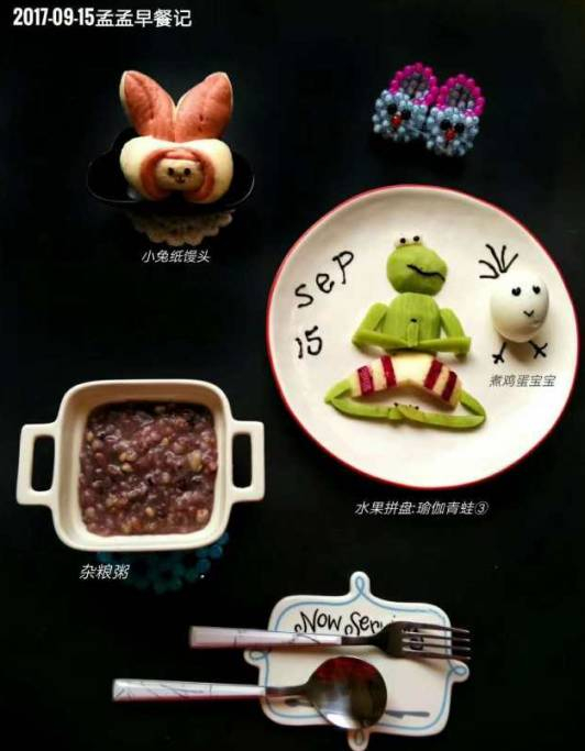 瑜伽青蛙王子水果拼盘,杂粮粥,煮鸡蛋宝宝,小兔子萌馒头