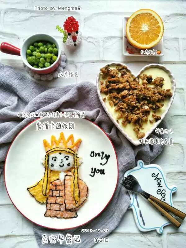 汤婆婆早餐:蓝蝴蝶花茶泡水与米饭混合后制作汤婆婆的裙子,用黑芝麻酱和红心火龙果汁与米饭混合后制作汤婆婆的头发和头饰,胡萝卜制作成耳环,黑芝麻酱制作表情和舞台