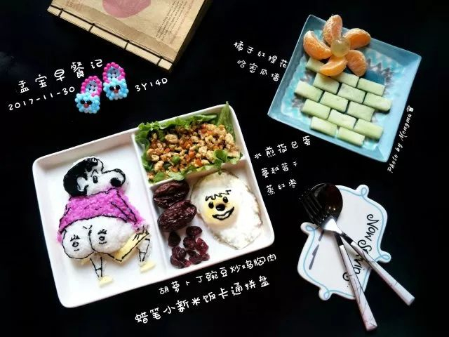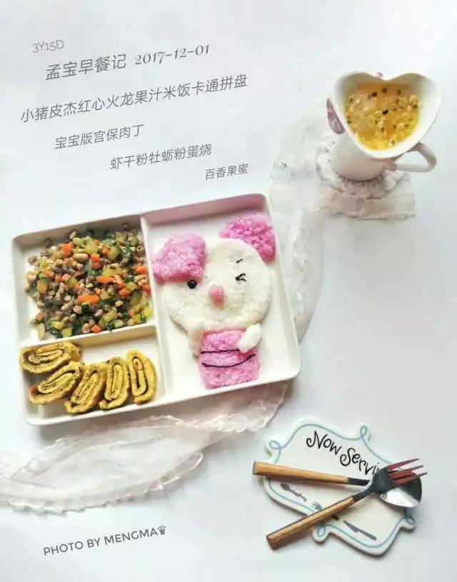 小猪皮杰火龙果汁卡通饭团,宫保鸡丁,虾干粉牡蛎粉蛋烧,黄冰糖百香果蜜