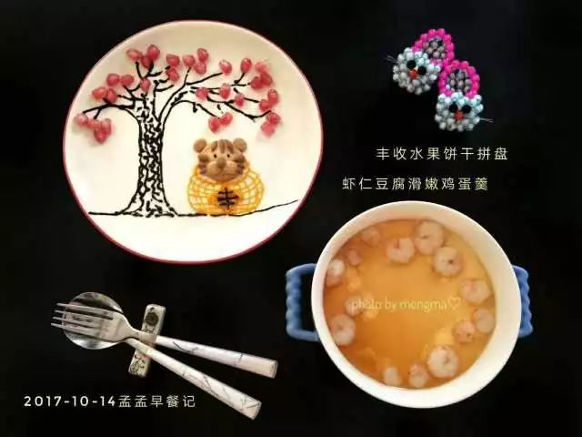 虾仁豆腐滑嫩鸡蛋羹,丰收水果饼干拼盘