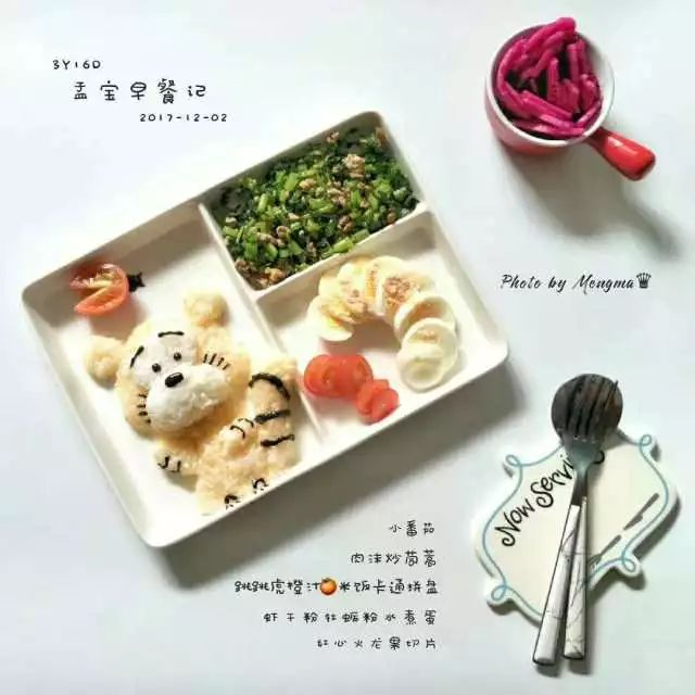 跳跳虎橙汁米饭,肉末茼蒿,营养粉水煮蛋,红心火龙果切片,小番茄瓢虫