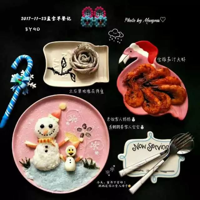 小雪人母子拼盘(米饭饭团妈妈,煮鹌鹑蛋宝宝,炒海带草,黑芝麻酱眼睛钮扣,蓝蝴蝶米饭土地,椰蓉雪花,苹果帽子围脖)茄汁大虾,火龙果玫瑰花