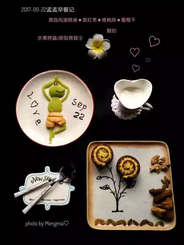 瑜伽青蛙王子水果拼盘,黑旋风蛋糕卷,核桃+葡萄干+蒸红枣+酸奶