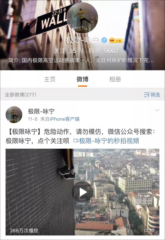 仅仅几个月时间,咏宁已经在各大短视频平台获得了总数超过100万的粉丝,并在个人介绍中自称为“国内无任何保护,极限挑战第一人”。