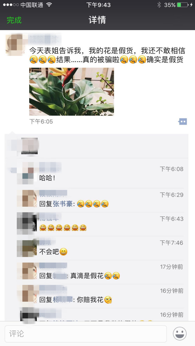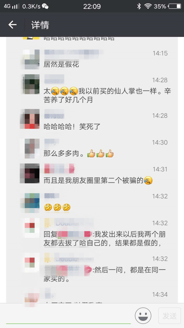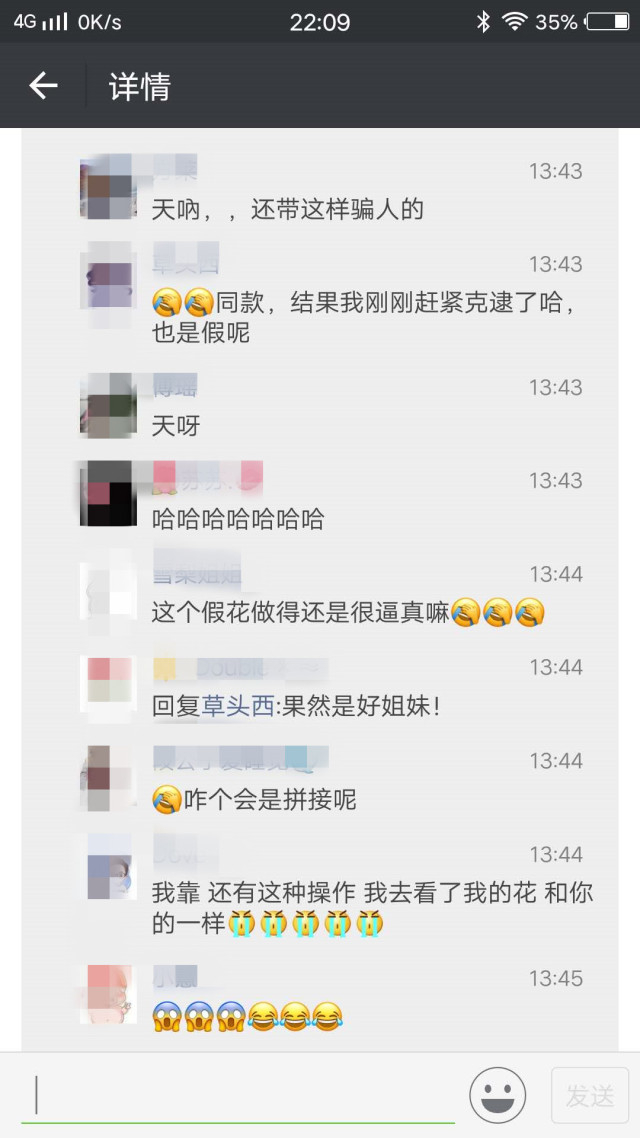 她说买花的时候,自己还摸了一下,很亲肤很自然啊。而且和同事站在旁边讨论花朵很久,老板也没有吭气啊。那个留言笑得肚子疼的同学说:这个造假技术太高超了,亲手摸,回家精心打理半年都没有发现......