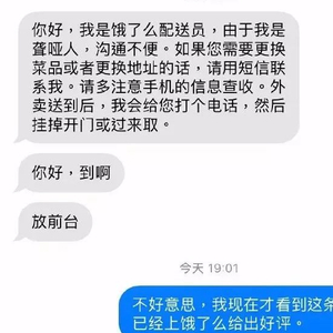 @aimili珊:不容易,大家互相理解,不要随便差评,我觉得可以给聋哑送餐员用MP3录制好声音:我是聋哑人我发了短信请看一看,快餐就要到了等会送到电话打给您就挂了下来取餐,谢谢。这样可能会感觉好也很方便。