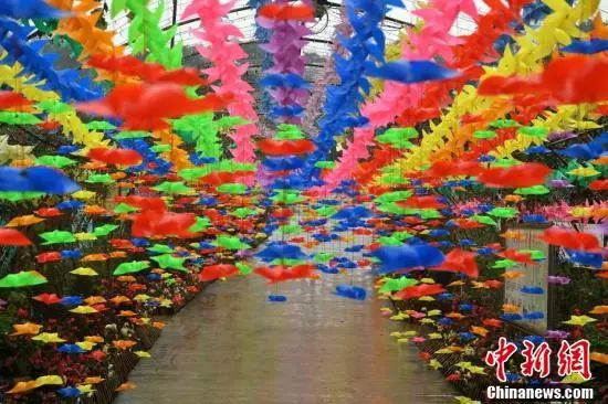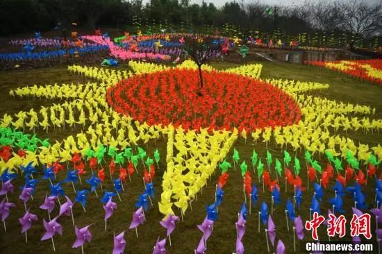 近日,重庆沙坪坝区凤凰花海景观园内,10万只小风车打造了彩色风车节,五颜六色的小风车摆出各种造型,夺目绚丽。