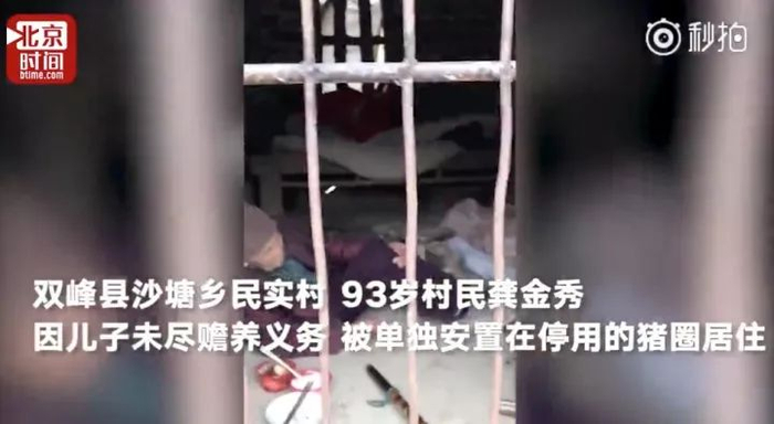 因三个儿子未尽赡养义务,湖南93岁老人龚金秀,寒冷冬日里被单独安置在停用的猪圈内。据悉,老人由三个儿子按月轮流赡养,近期轮到小儿子照顾。事发时,小儿子在外打工,小儿媳便将老人安置在杂屋。目前,警方已控制小儿媳。