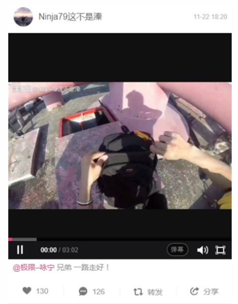 11月22日,网名为“Ninja79这不是溱”的男子发布了一条极限高空运动视频,并配文:@极限咏宁 兄弟一路走好!