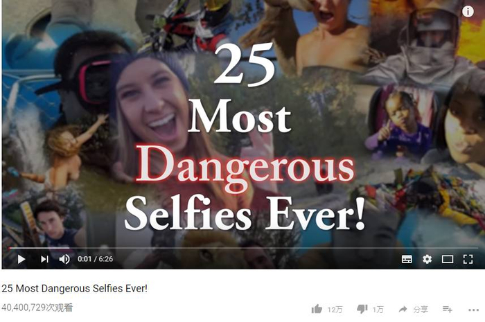 YouTube 上也曾发布过一个剪辑视频,名为《25 Most Dangerous Selfies Ever》(25 张有史以来最危险的自拍),点击量已经超过4000万次。