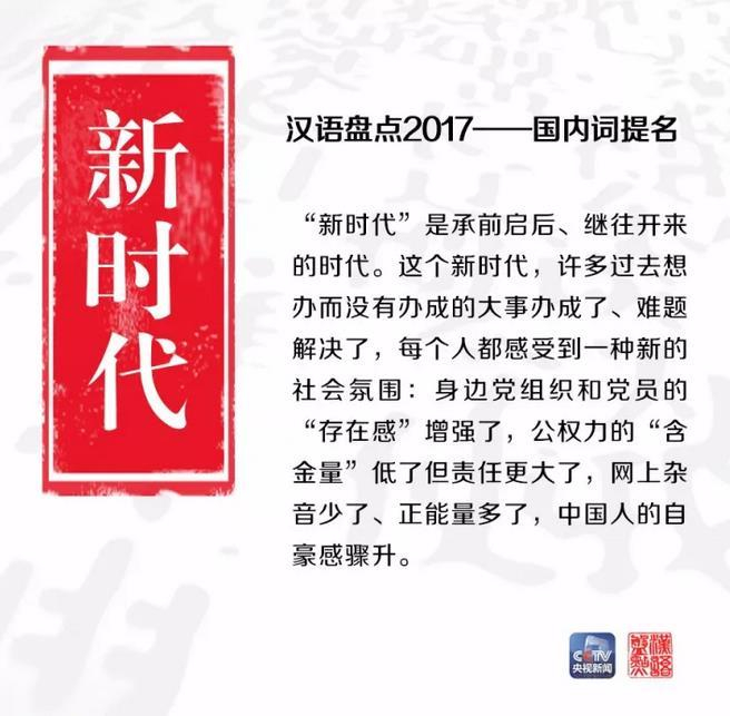 网友贺某推荐年度词“新时代”:新航母,新科技,新技术,新经济发展方式,新的全球治理理念。这是中国人的新生活,这是我们的新时代!