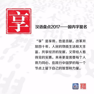 网友杨某推荐年度字“享”:共享单车的风行,开启了全民“共享”时代。可以预见,今后以科技便民的共享领域会有越来越多的“新成员”,并从国内一直影响到世界,让世界各地民众共享科技带来的便利。