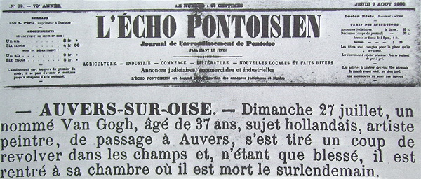 总的说来,可以肯定的是他死于1890年7月27日在巴黎以北20英里外的奥威尔镇或是附近所受的枪伤。他是在所居住的旅店吃完午饭后,带着绘画工具外出去画画的某个时间受的伤。在晚饭刚过的时候,他回到了拉乌旅店,上腹部中弹。他请了医生来治疗,但他的伤口却是致命的。大约在30个小时之后,文森特离开了人世。