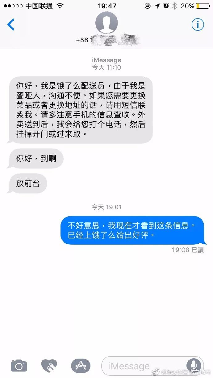 点外卖之后接到几个没有声音的来电,都是一接通就挂断,当时以为是恶作剧,所以忍不住发了脾气,后来才发现外卖员的短信。原来外卖员是聋哑人,在短信里解释了沟通不便的苦衷,需要通过打电话来提醒顾客外卖已送到的讯息。