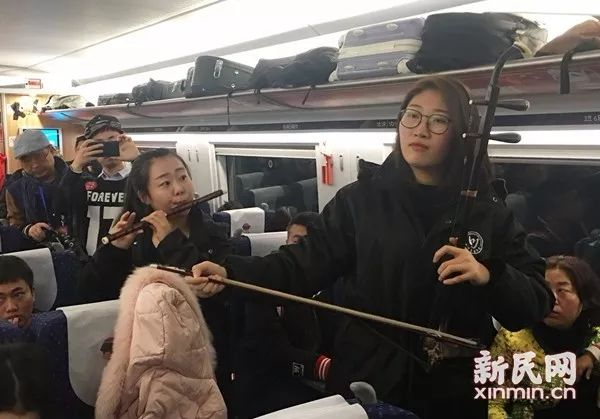 四川音乐学院学生在首发车厢演奏陕北和四川民歌。新民晚报记者 范洁 摄