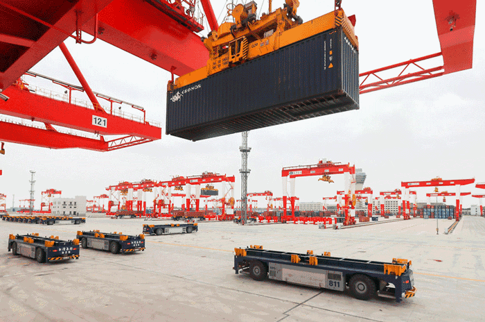 洋山四期的装卸设备购自上海振华重工,桥吊、AGV和轨道吊均为中国制造,自动化技术全球领先。