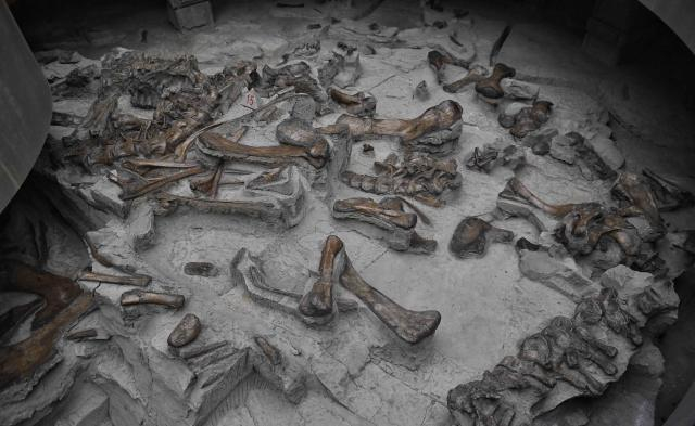 ↑自贡恐龙博物馆内展出的遗址原貌(12月7日摄)。
