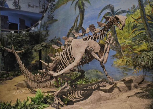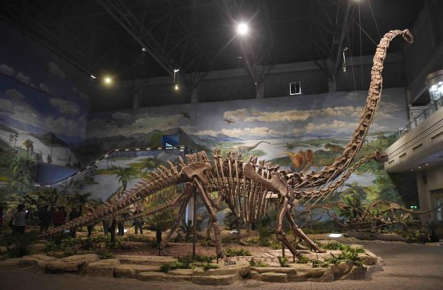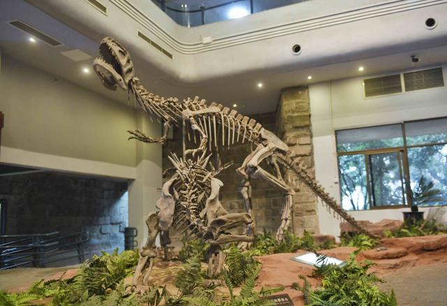 ↑自贡恐龙博物馆内展出的四川巨棘龙化石(12月7日摄)。