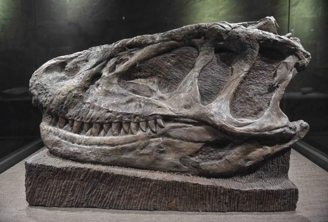 ↑自贡恐龙博物馆内展出的和平永川龙头骨化石(12月7日摄)。