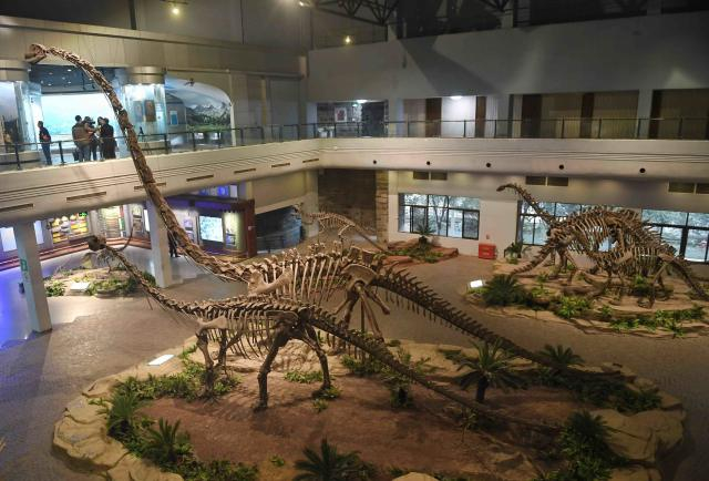 ↑自贡恐龙博物馆展出的太白华阳龙化石(前)和自贡四川龙化石(12月7日摄)。