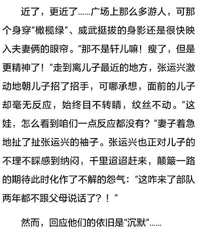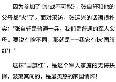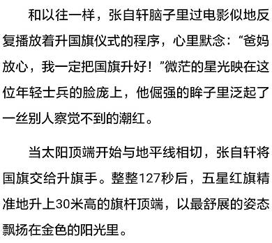 “爸,妈,你们不知道,当时,我们的脚步声有多整齐多有力。我从来没有感觉过那么骄傲,我肩上的国旗重千钧啊!”隔着电话,夫妻俩仿佛能听到儿子激动的心跳声。张运兴也受到了感染,冲着电话大声地说:“轩儿,加油!你和你的战友都是好样的!”