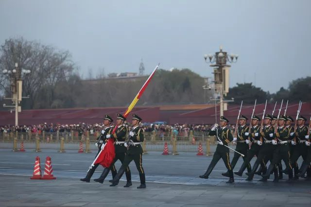 △国旗护卫队走向金水桥,准备进行降旗。崔 靖 摄