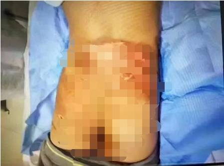 整个阴囊、左右两个大腿内侧、腰部都被大面积的烫伤。创伤部位皮肤大面积脱落,大块鲜红的肉显露在外面,鲜血从边缘浸出,创伤周边的皮肤被烫得发乌。受访者供图