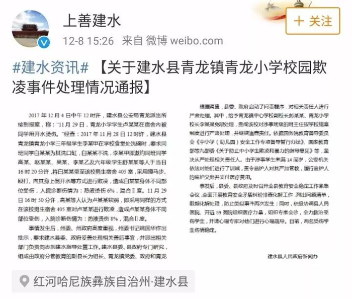 8日,建水县人民政府新闻办发布新闻通稿,通报建水县青龙镇青龙小学校园欺凌事件处理情况: